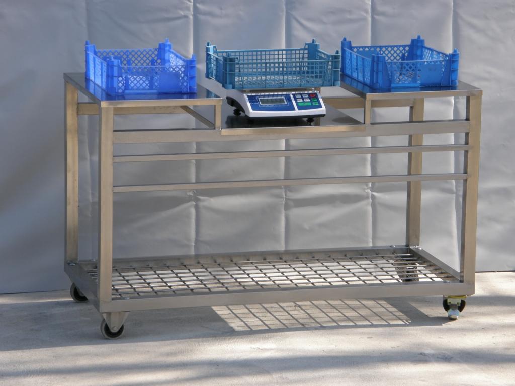 - Wózek do sortowania i ważenia pieczarek – konstrukcja takowego wózka została wykonana z profila zamkniętego ze stali kwasoodpornej. Na spodzie wózka zamocowano dodatkową siatkę zgrzewaną która służy jako półka.
