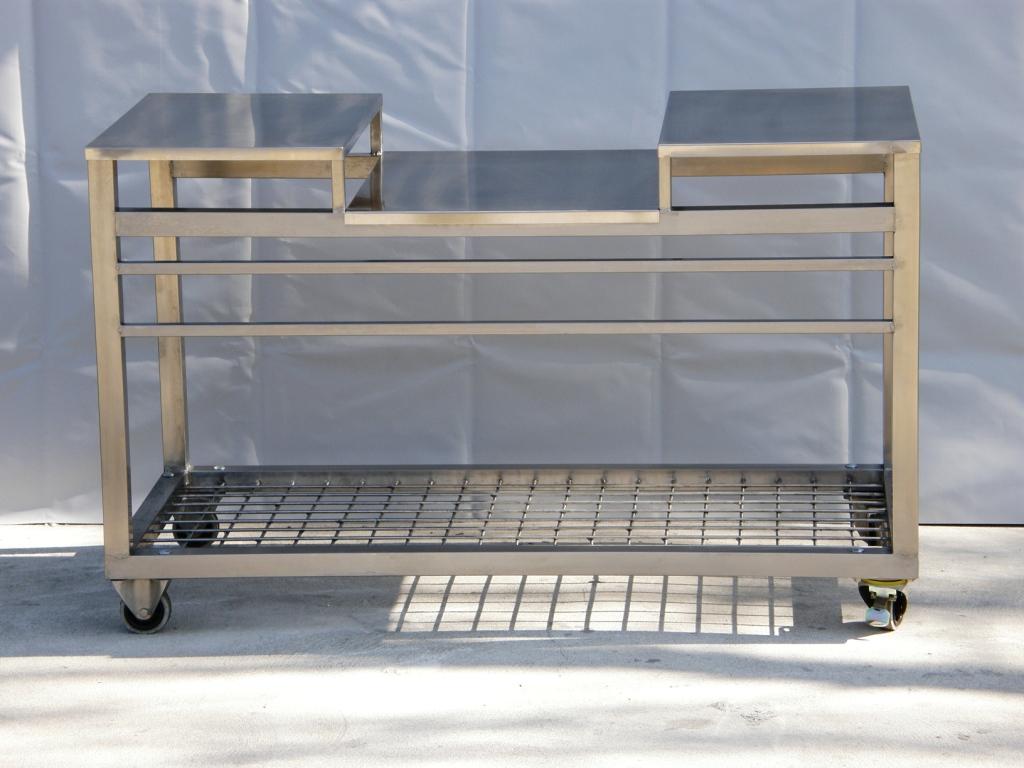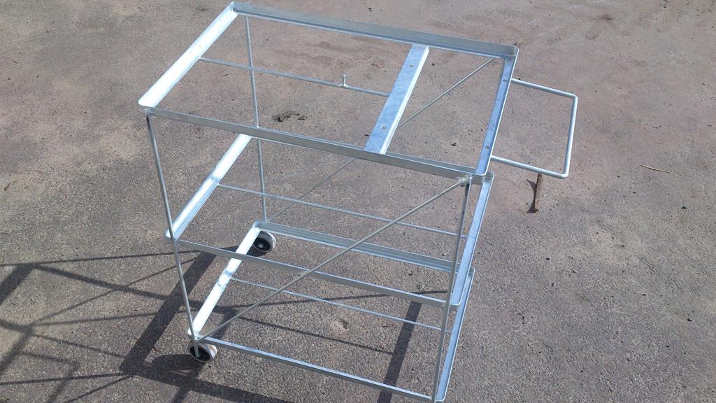 - Wózek do sortowania i ważenia pieczarek – konstrukcja takowego wózka została wykonana z profila zamkniętego ze stali kwasoodpornej. Na spodzie wózka zamocowano dodatkową siatkę zgrzewaną która służy jako półka.