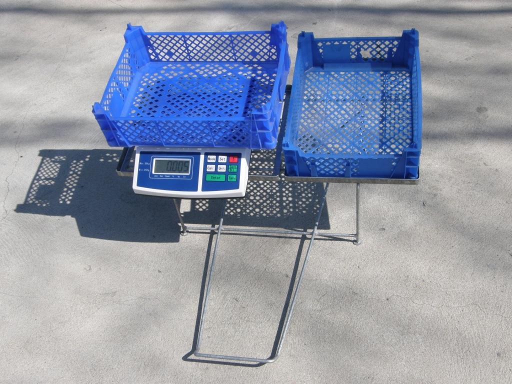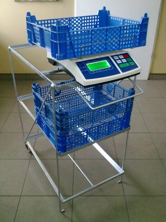 - Wózek do zbioru pieczarek z 1-ej oraz 2-ej półki - wykonany jest z wysoko gatunkowego pręta, który zapewnia dużą wytrzymałość, stabilność konstrukcji a zarazem jej lekkość. U góry wózka zamocowane są specjalne ramki w których to umieszcza się wagę oraz kosz.